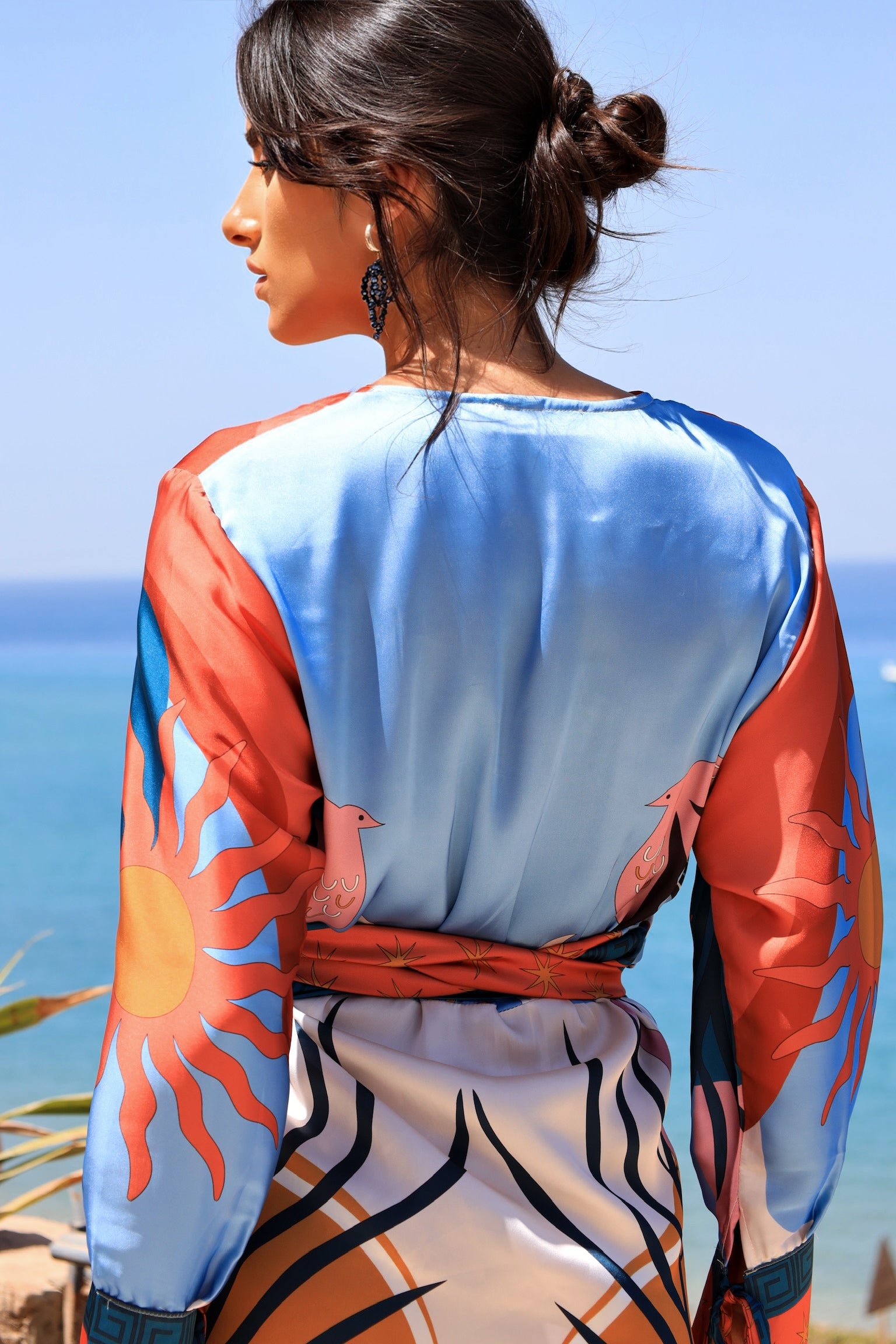 Turn heads with the celestial satin silk wrap-up dress with fringes, a stunning piece that blends elegance and modern flair. Made from luxurious satin silk, this dress offers a beautiful sheen with an adjustable waist tie, and long sleeves. Tailored to accentuate the waist creating a flattering and feminine silhouette. Adorned with delicate gold fringes, adding a touch of bohemian charm. Pair it with heels for an elegant evening look or with sandals for a chic daytime ensemble.