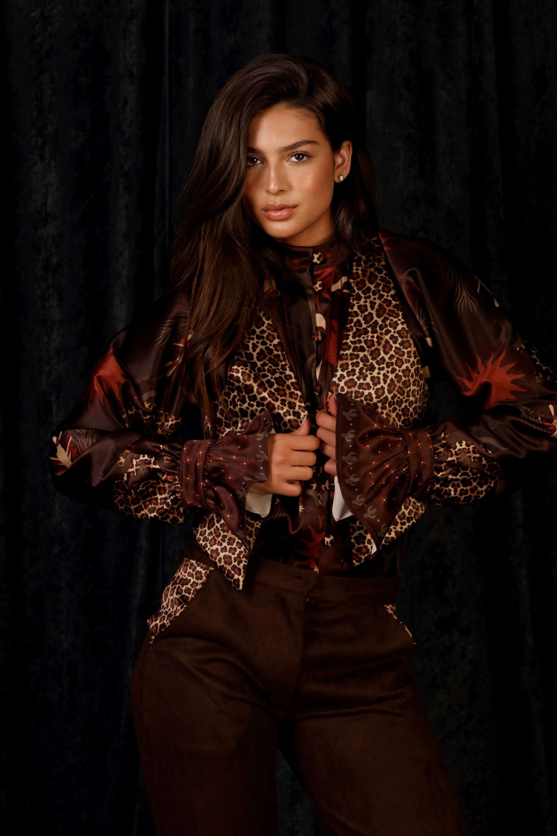 A statement set designed with rich brown suede and bold cheetah details. The double-sided vest can be worn two ways ,one side in soft brown suede, the other in smooth cheetah satin for a different look.